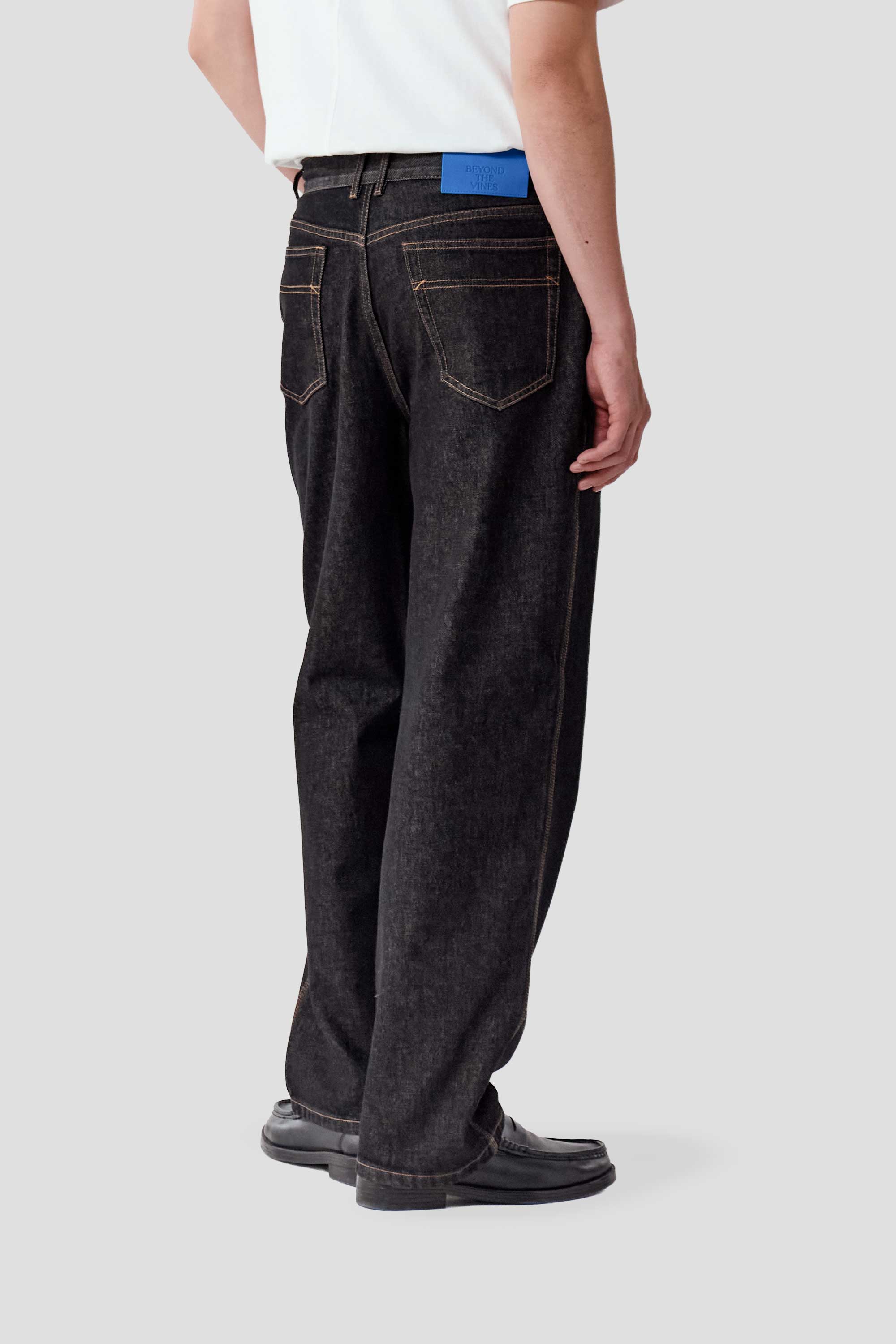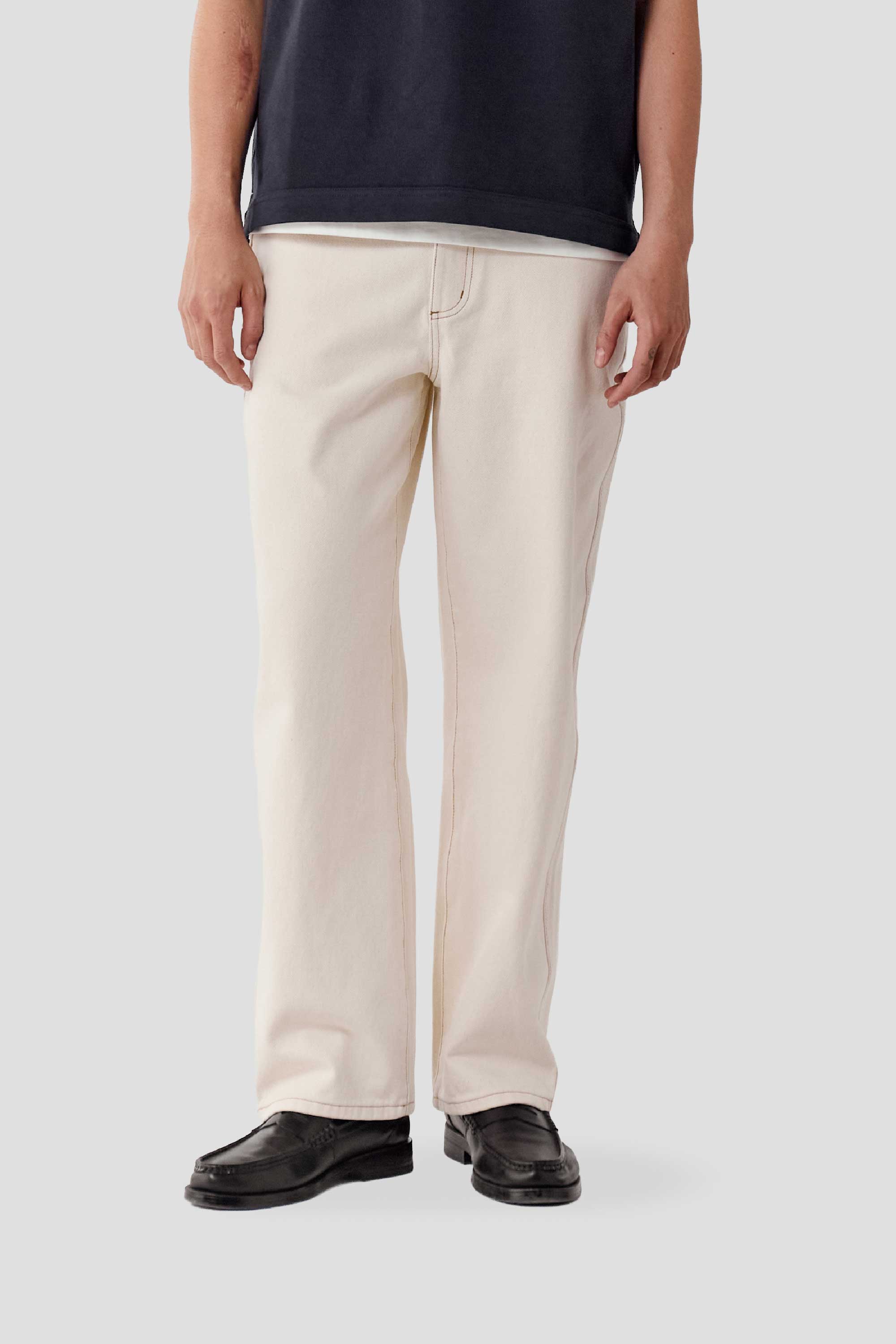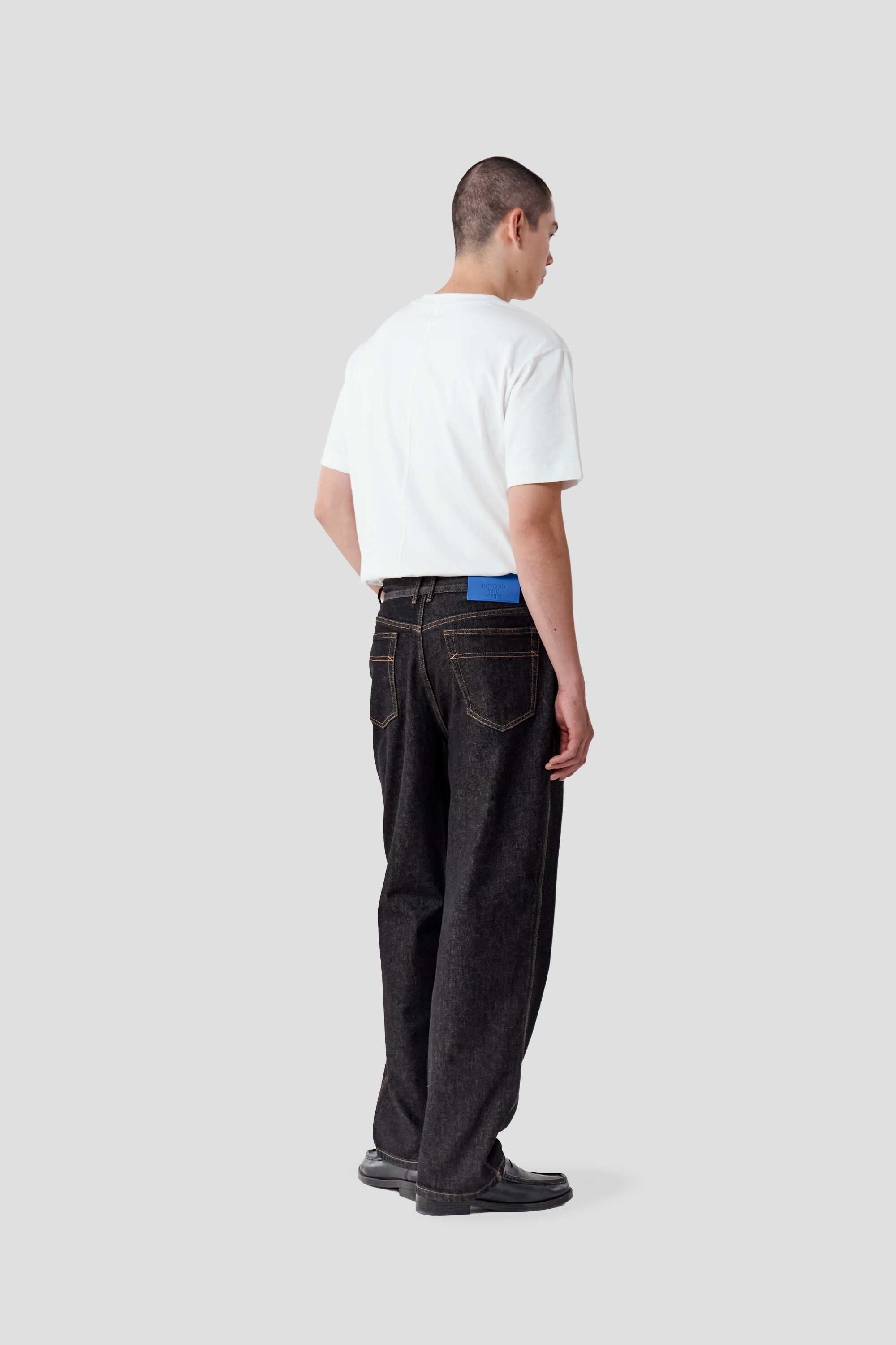Expect some colour transfer in the first few washes. Wash cold in a garment bag on a gentle cycle with similar colours. Line dry only; do not tumble dry. Slight irregularities and up to 5% shrinkage are natural to denim. Colour may transfer to light fabrics—wear with care as your denim evolves over time.