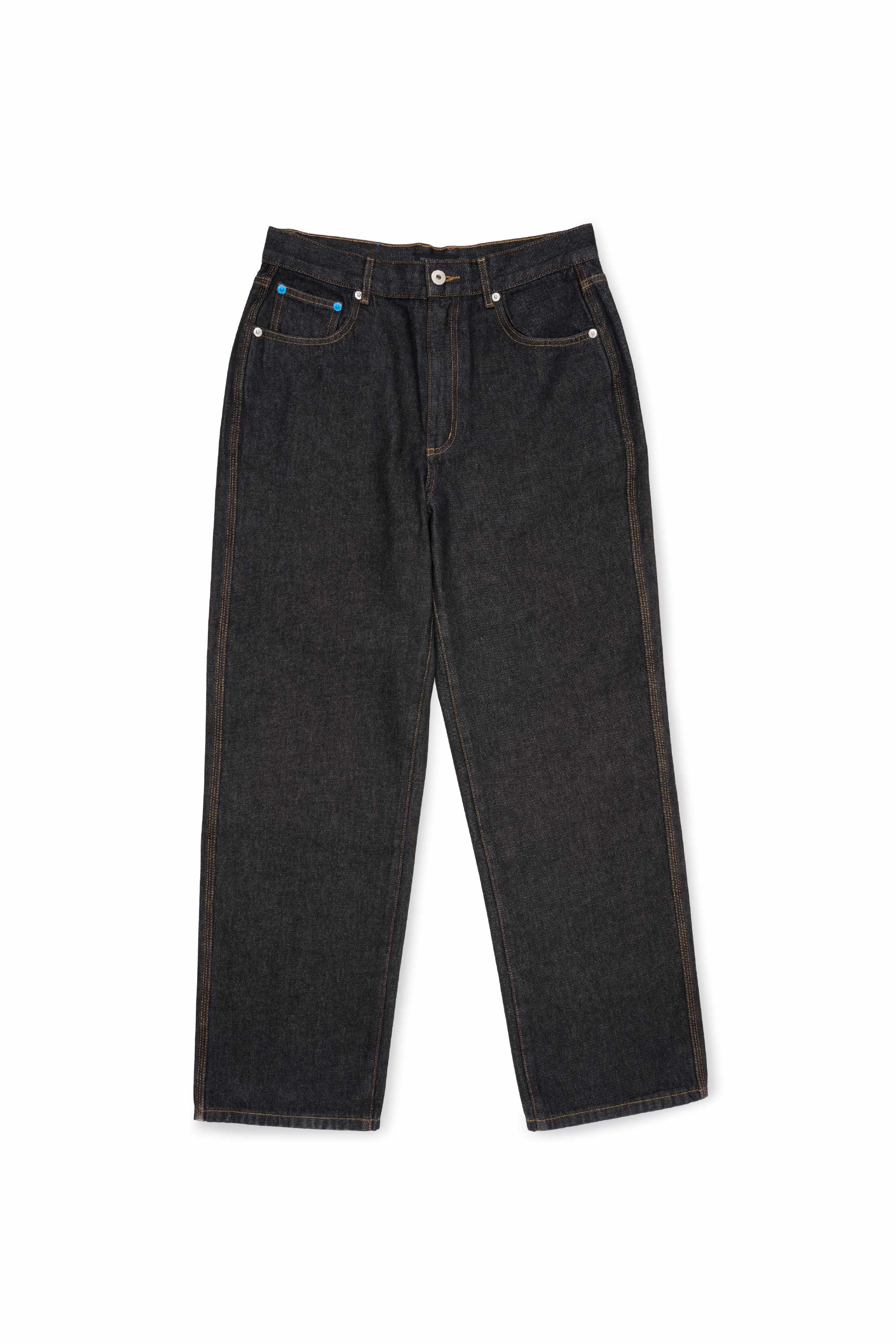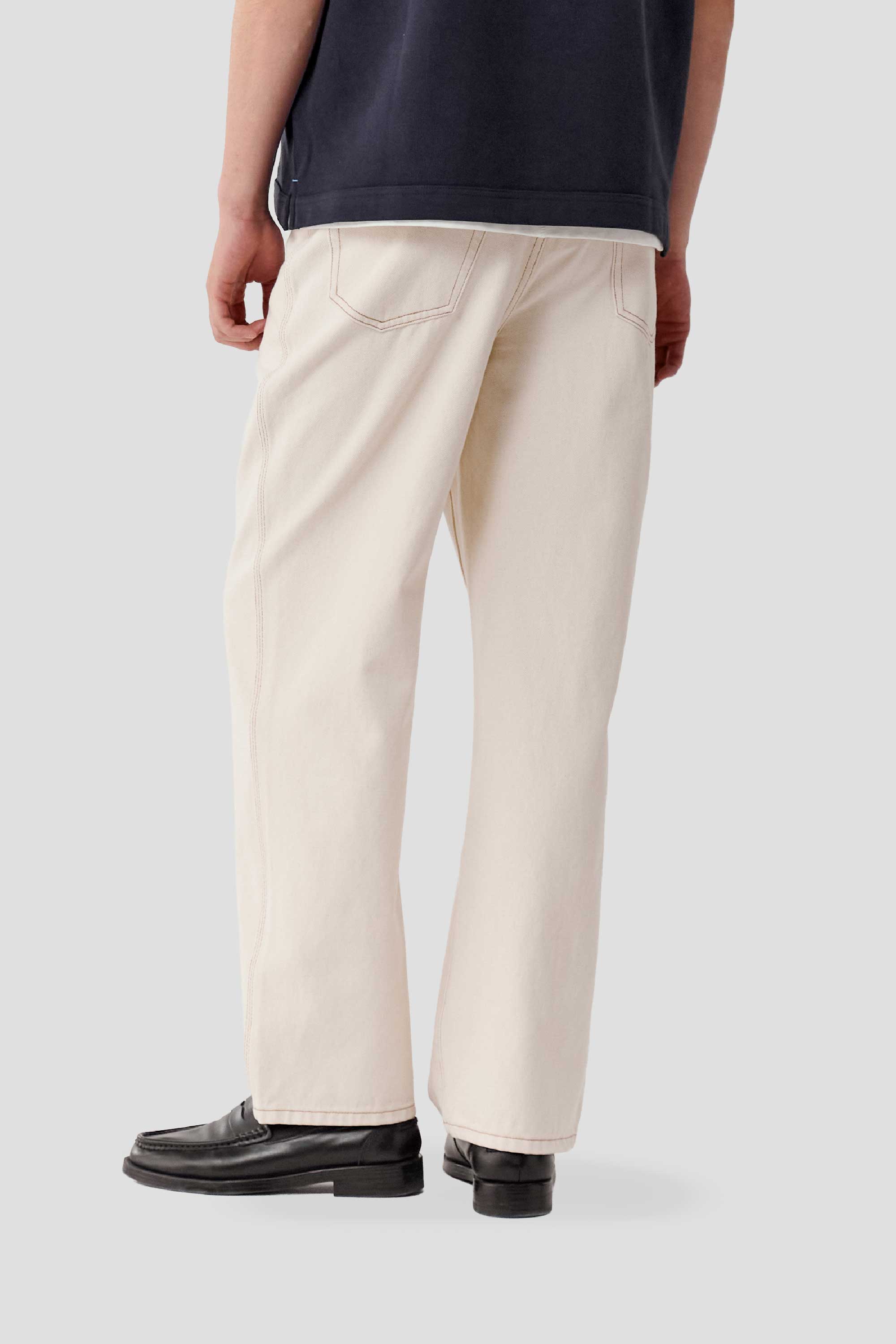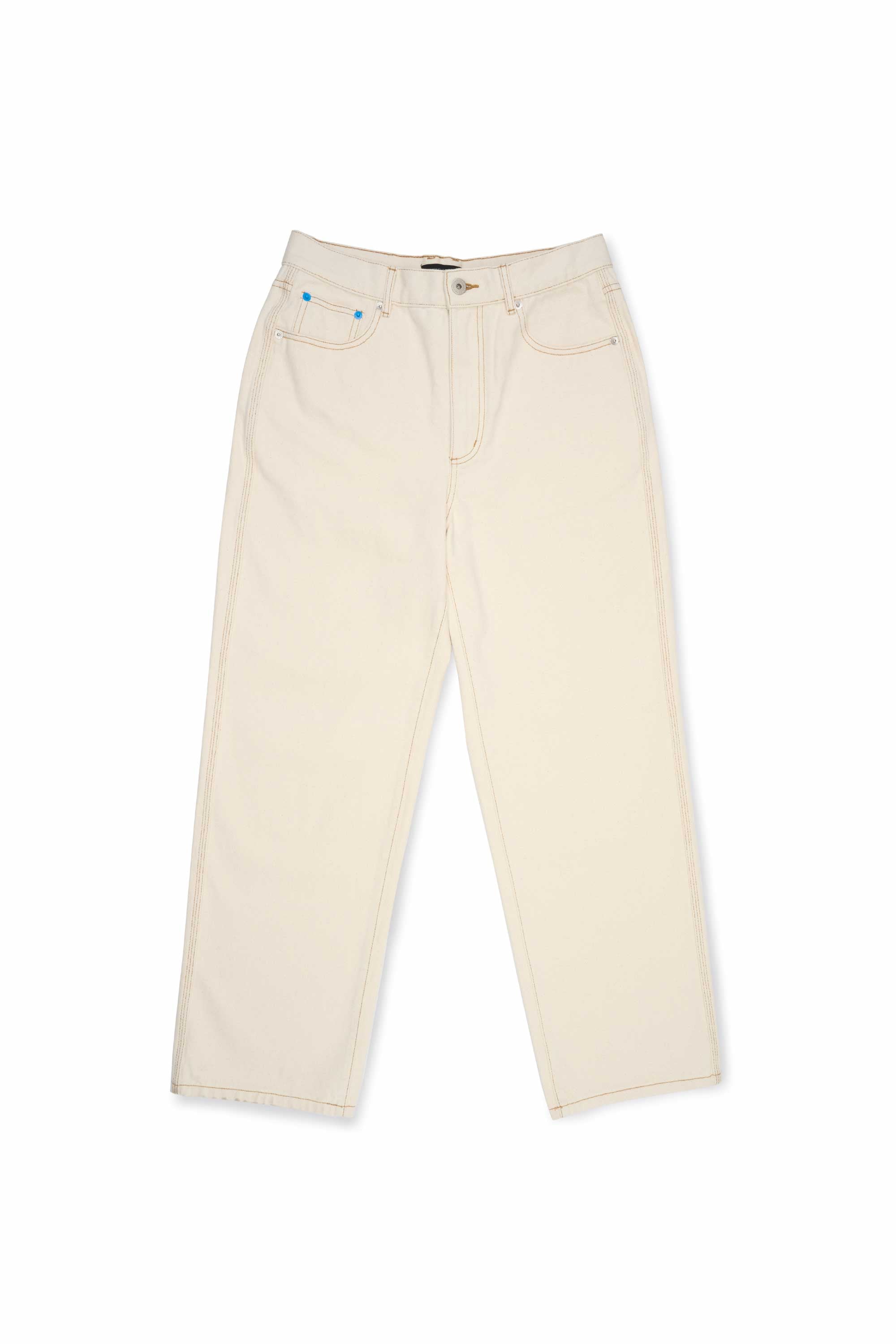 Made with 100% cotton denim, this classic trouser features an easy straight silhouette and contrast stitching. It is finished with engineer blue rivet details and a signature suede brand label on the back.