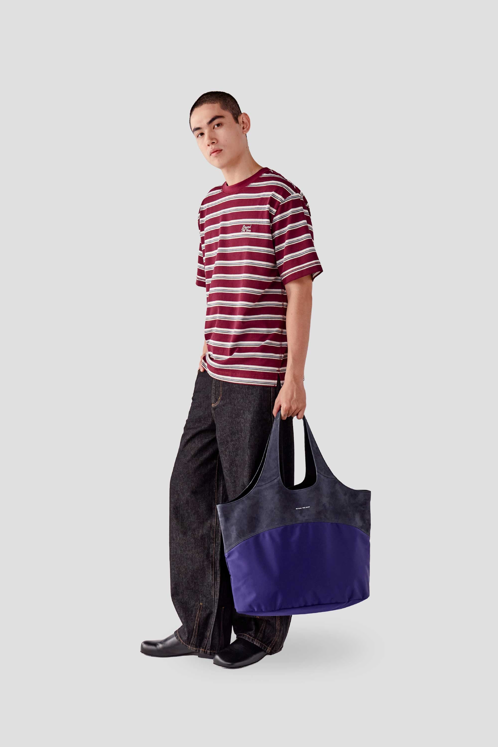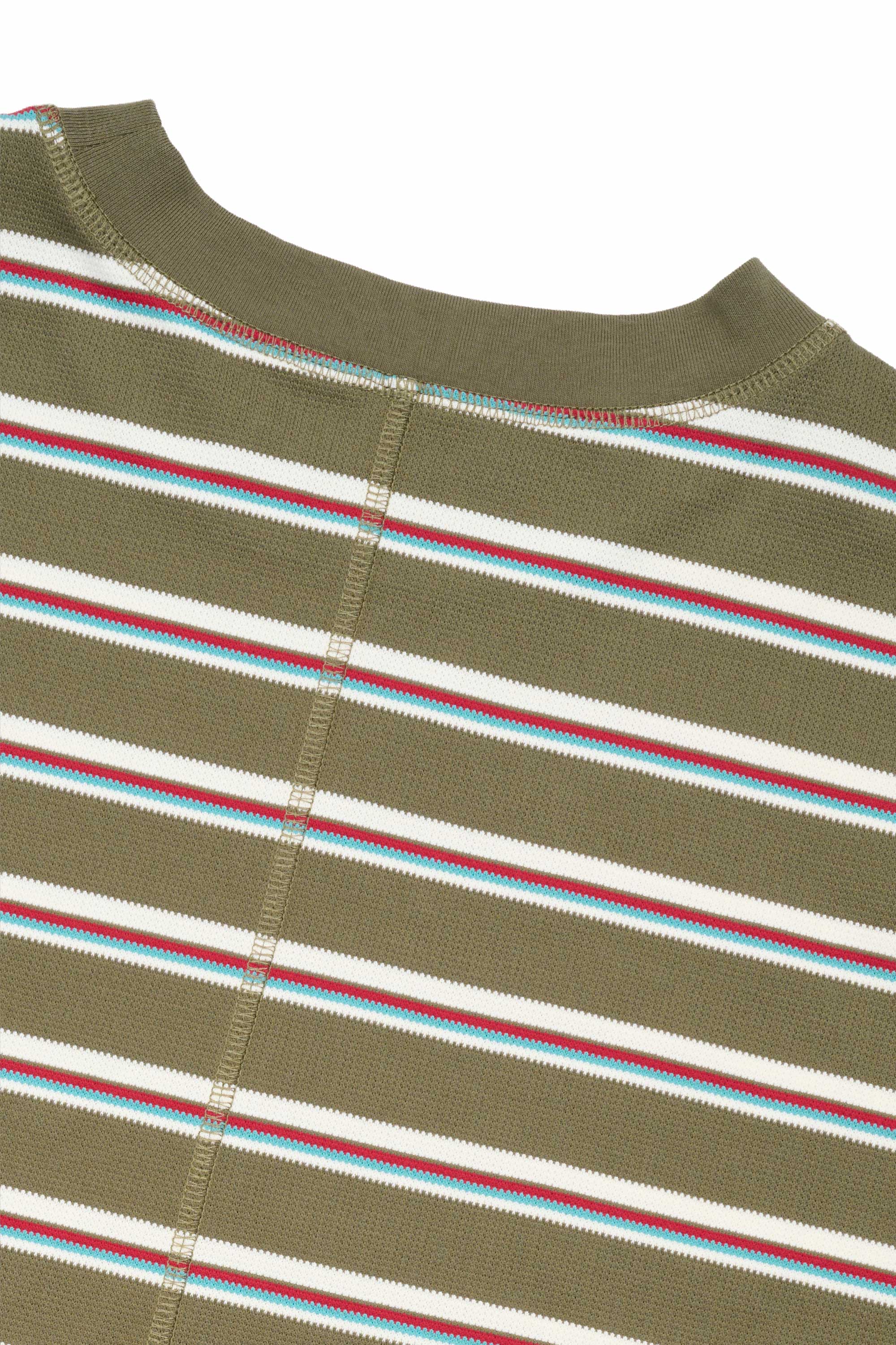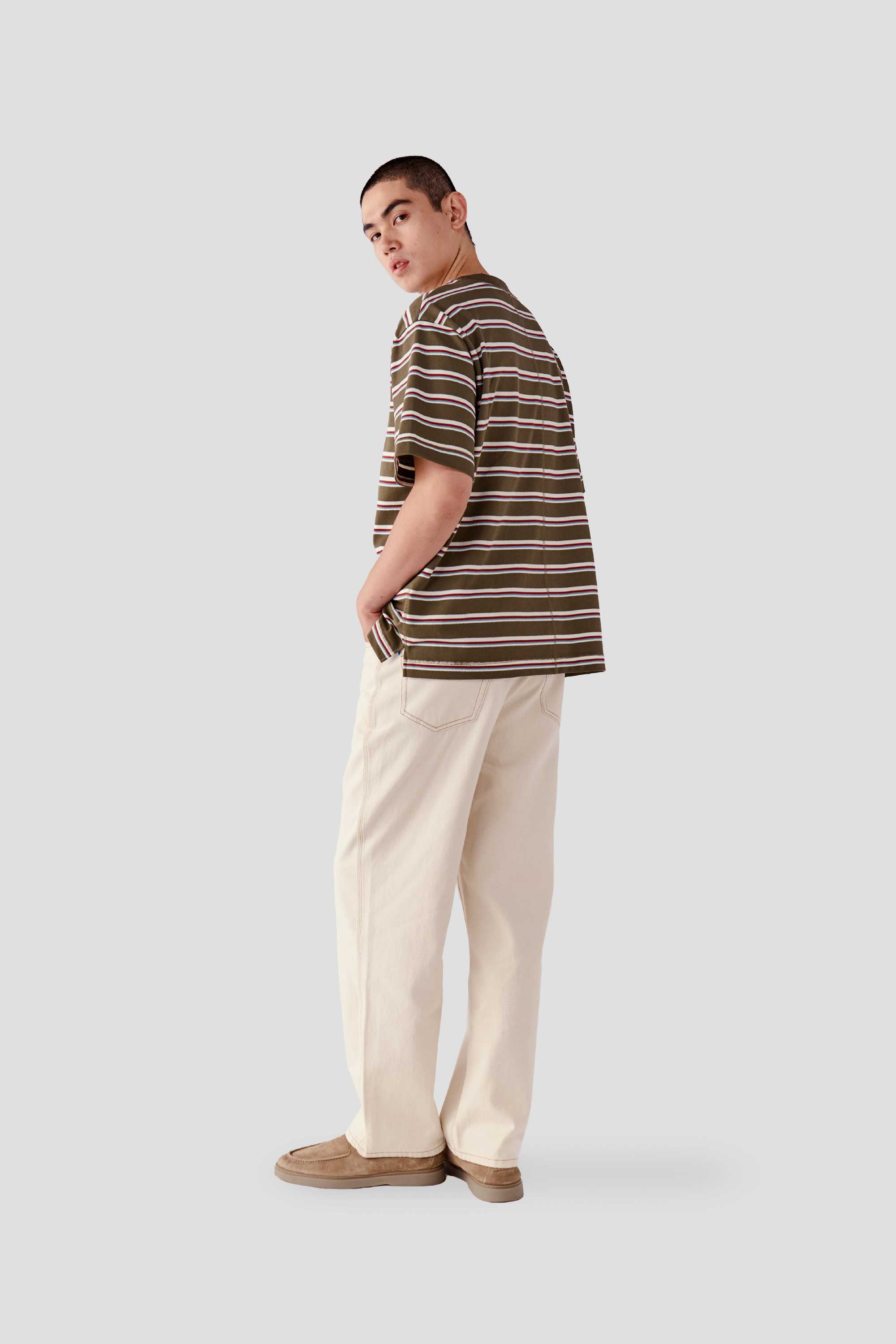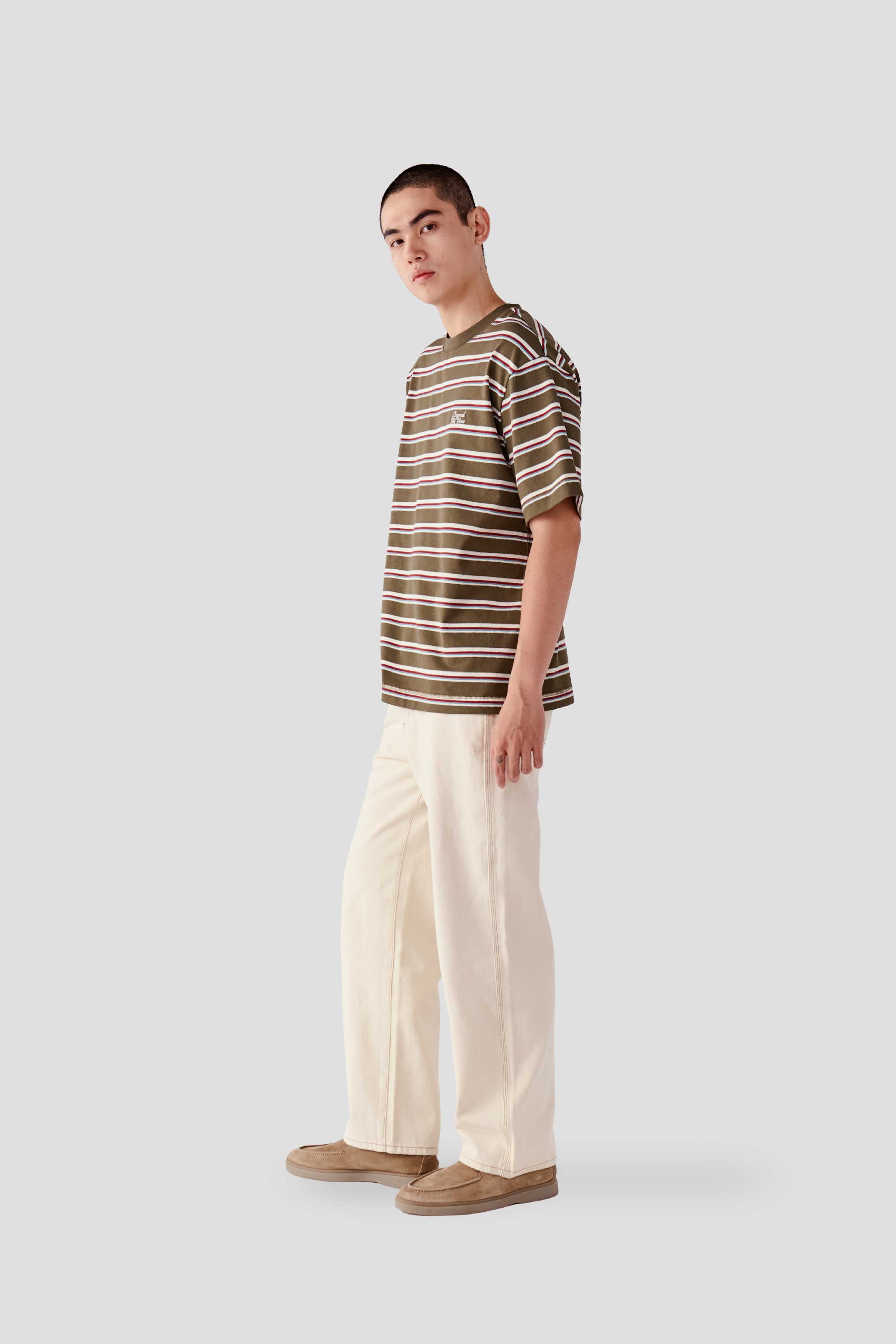 Made with textured cotton blend, this striped relaxed T shirt features a clean round neckline, dropped shoulder seams and a back seam detail. It is finished with a chainstitch embroidered logo.