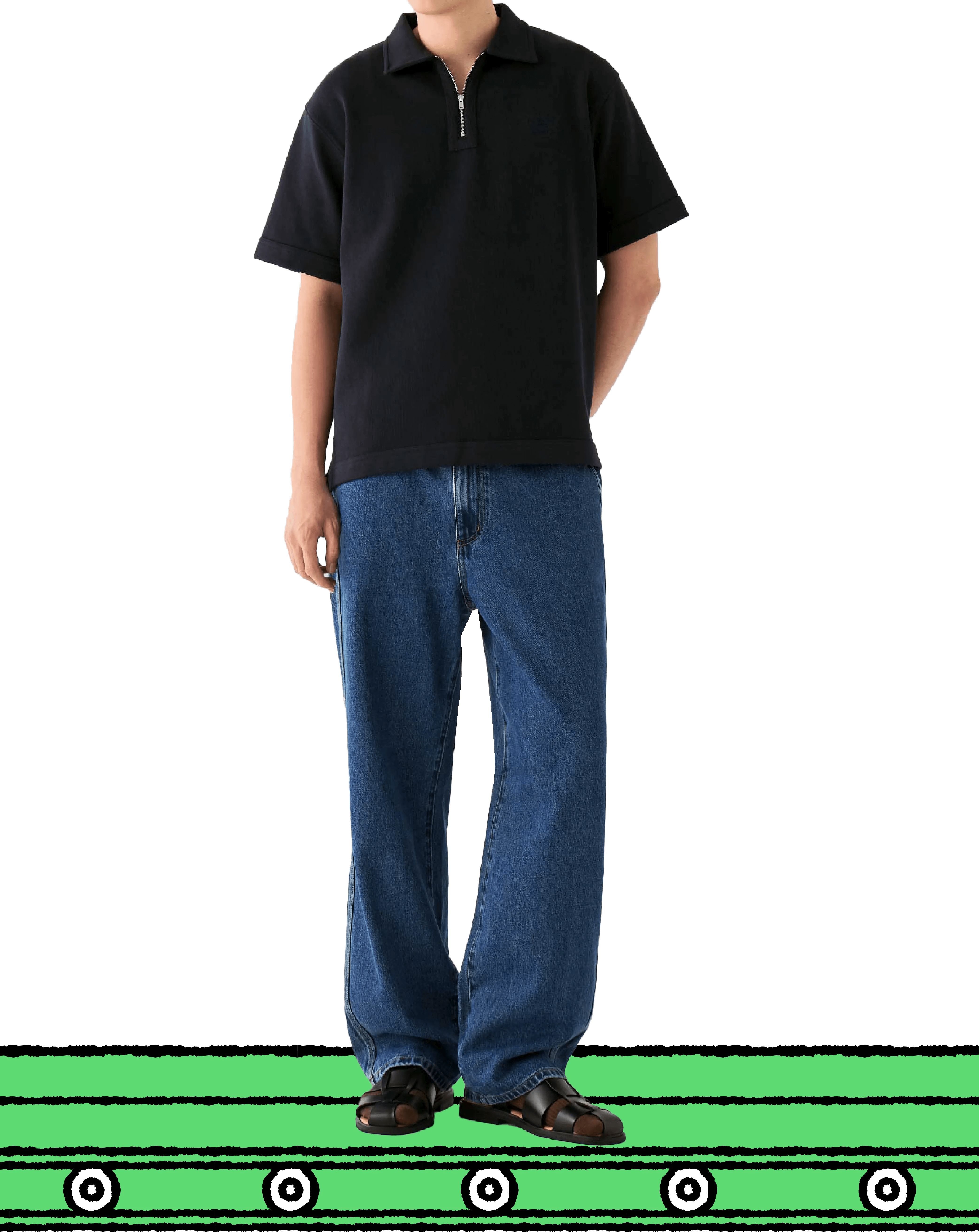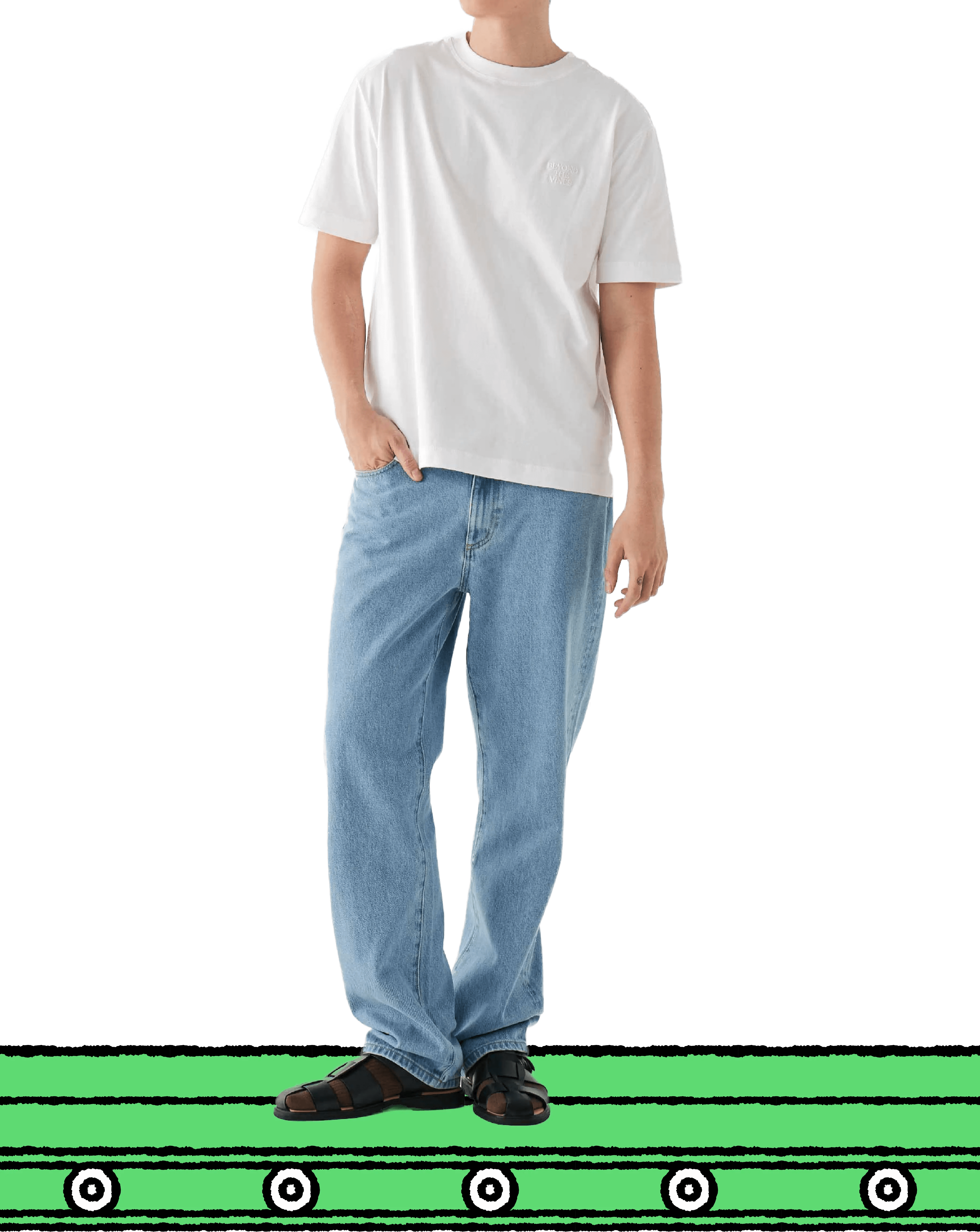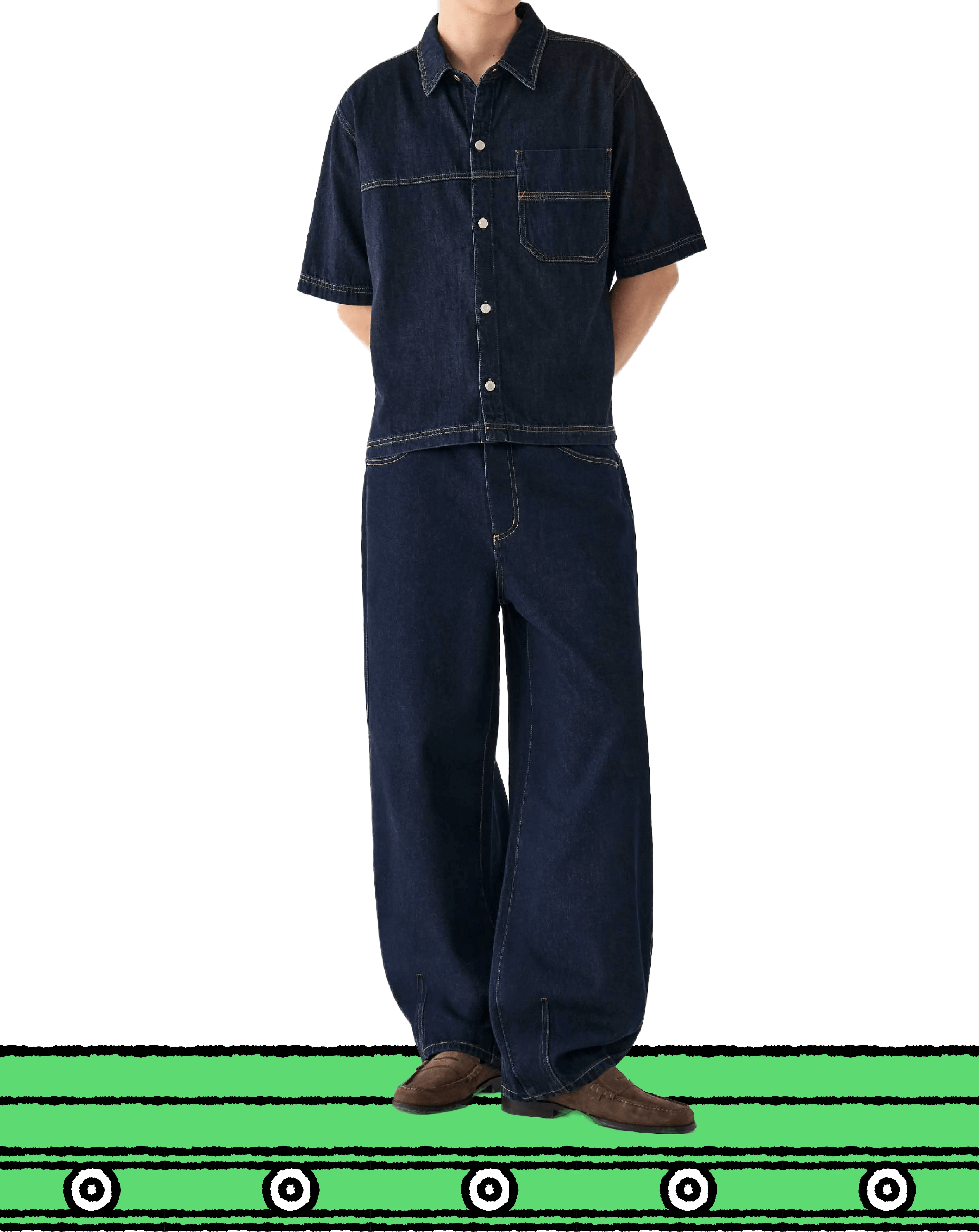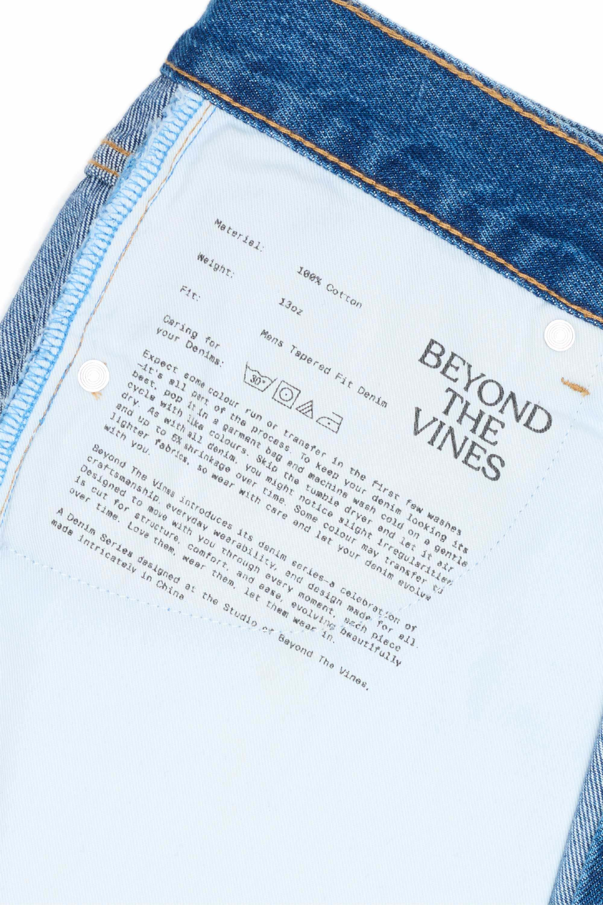 Expect some colour transfer in the first few washes. Wash cold in a garment bag on a gentle cycle with similar colours. Line dry only; do not tumble dry. Slight irregularities and up to 5% shrinkage are natural to denim. Colour may transfer to light fabrics—wear with care as your denim evolves over time.