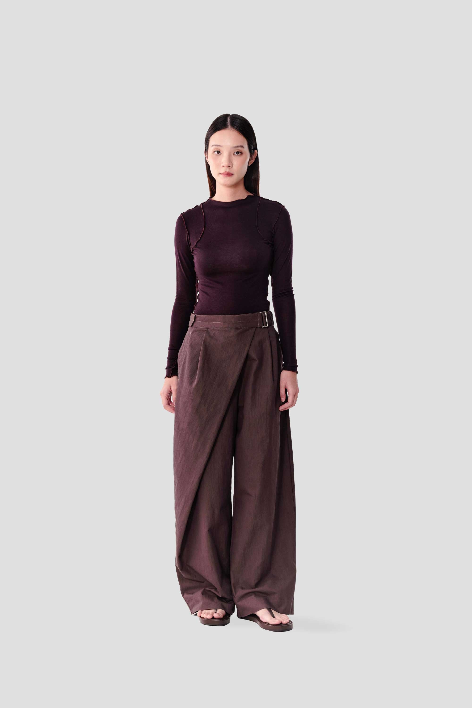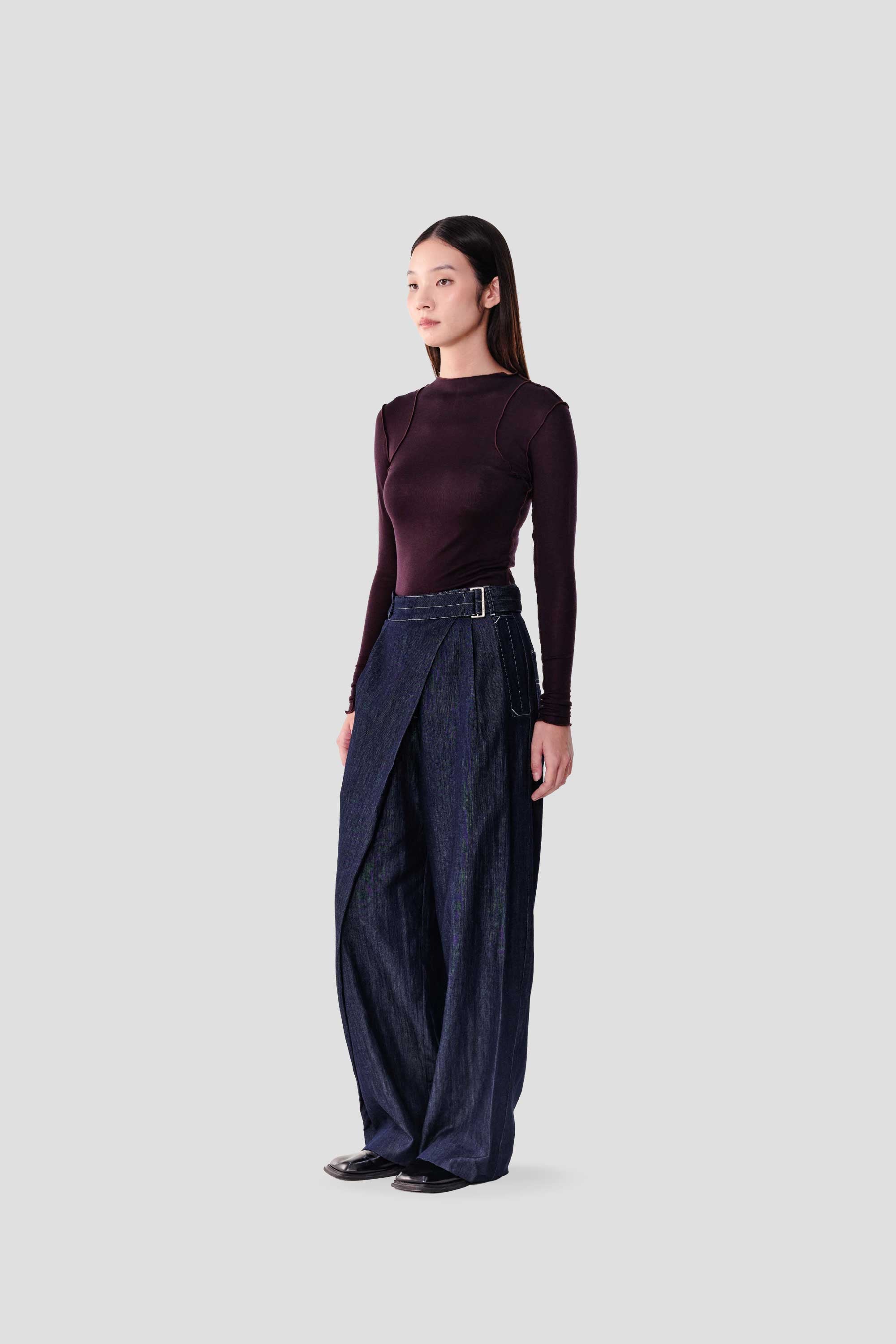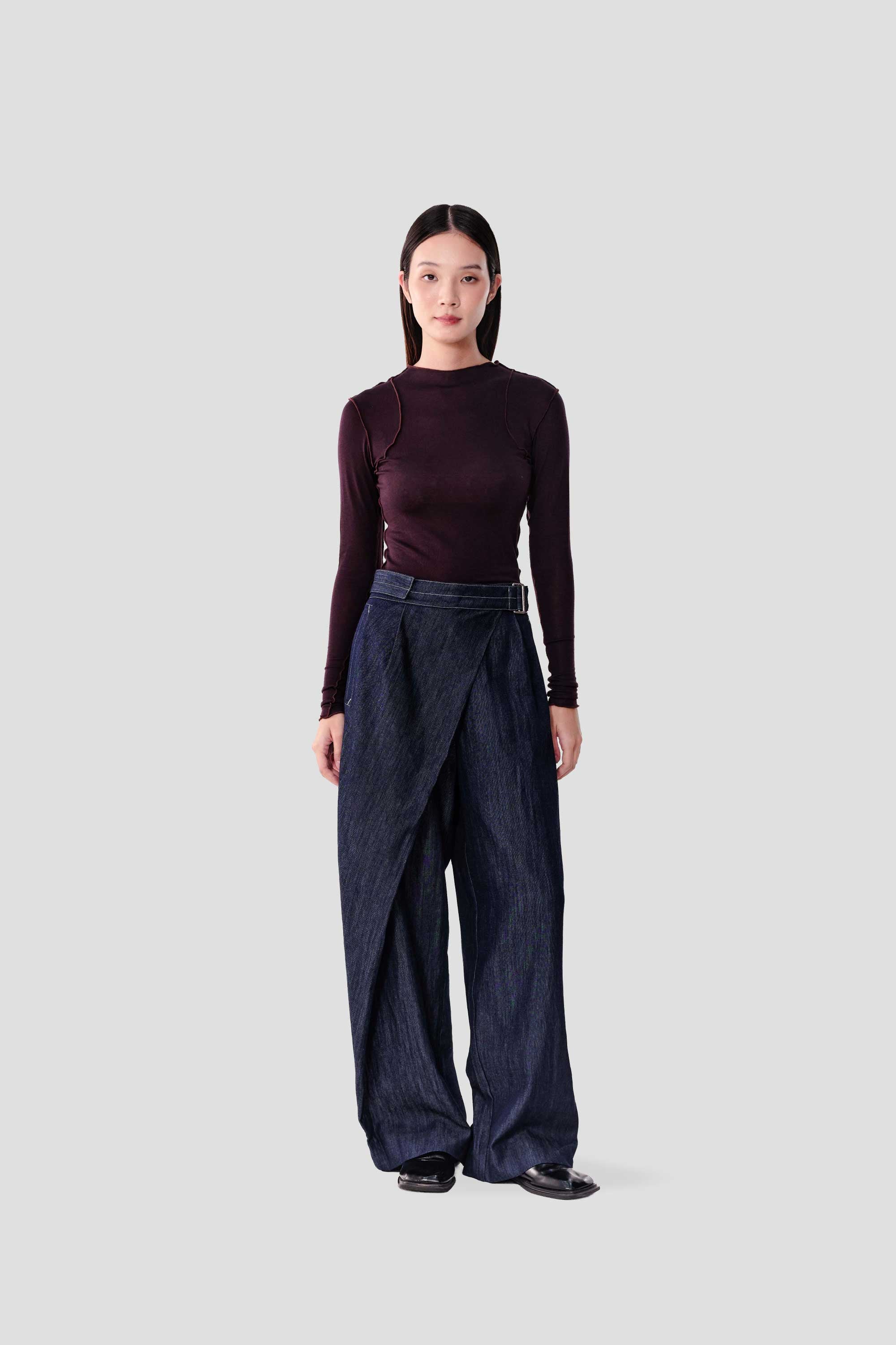 Crafted from smooth twill, the Front Wrap Trouser features a structured silhouette with an elevated, relaxed look. Designed with a wrap front and integrated belt detail, they are finished with subtle topstitching throughout. Cut to a full length profile, the style is complete with large welt side pockets and back pockets for functionality.
