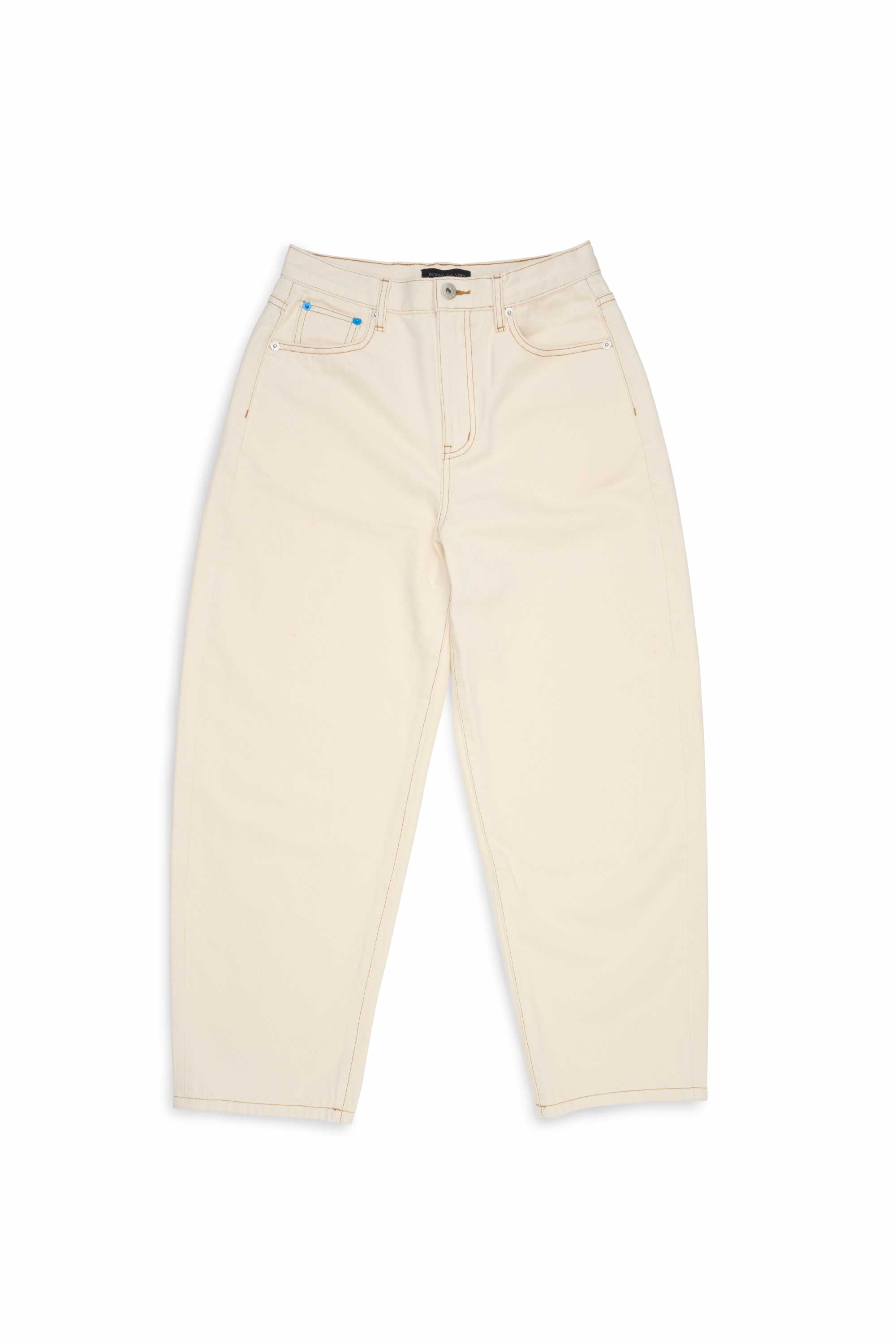 Made with 100% cotton denim, this classic trouser features a flattering barrel silhouette and contrast stitching. Made to sit comfortably on the waistline, it is finished with engineer blue rivet details and a signature suede brand label on the back.
