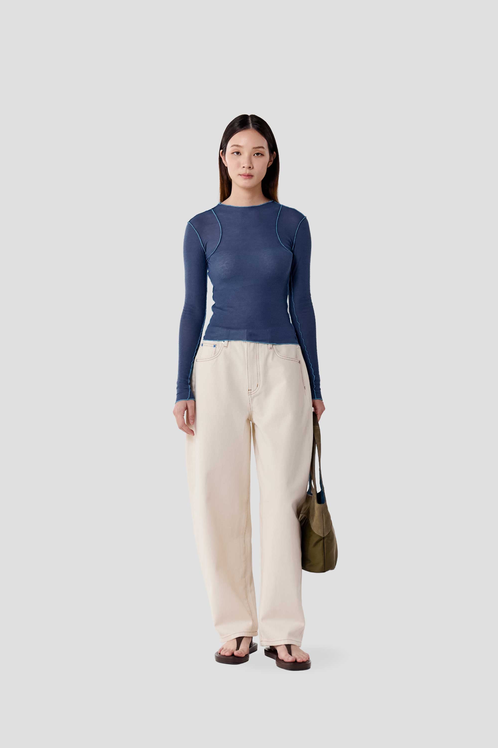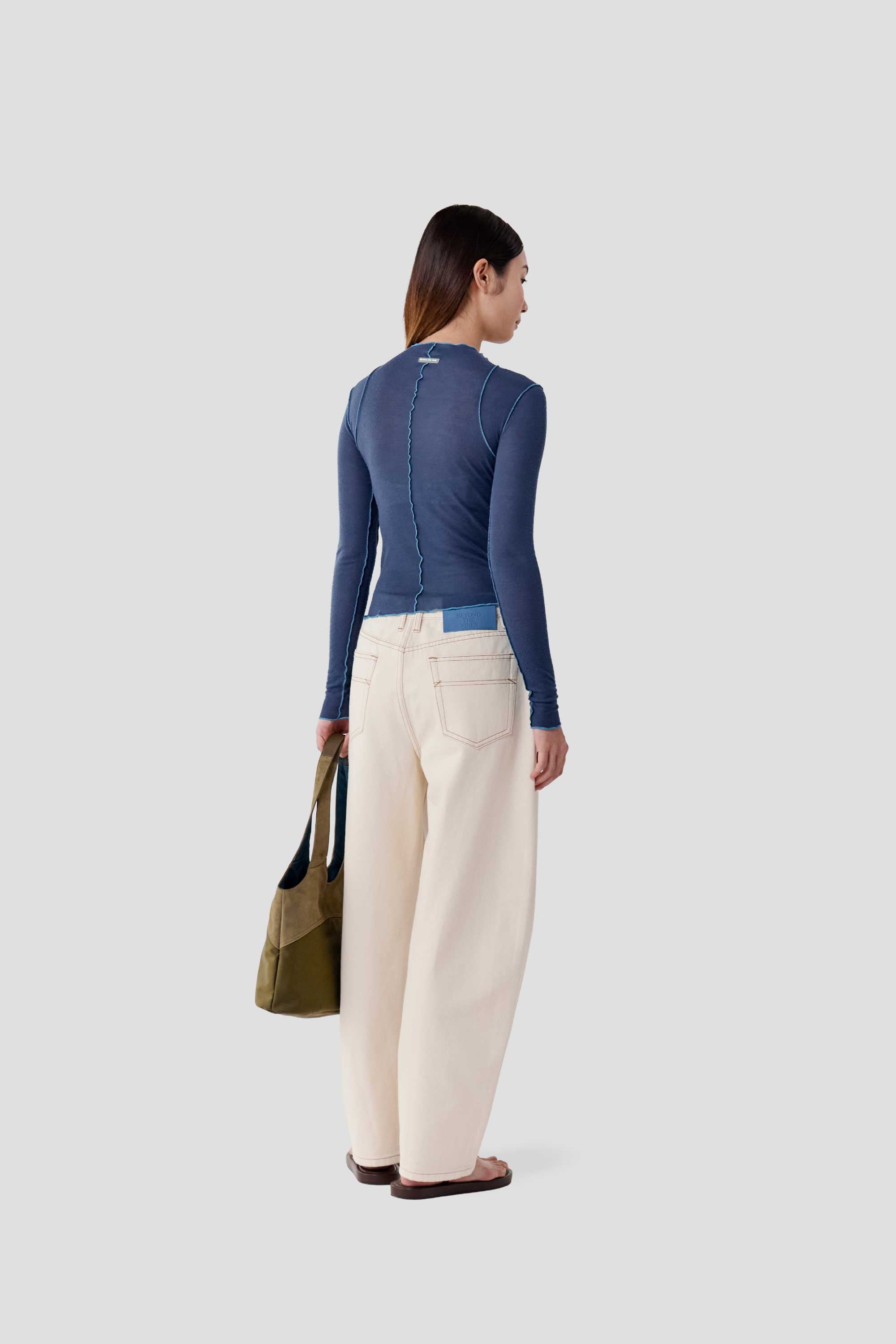 Expect some colour transfer in the first few washes. Wash cold in a garment bag on a gentle cycle with similar colours. Line dry only; do not tumble dry. Slight irregularities and up to 5% shrinkage are natural to denim. Colour may transfer to light fabrics—wear with care as your denim evolves over time.